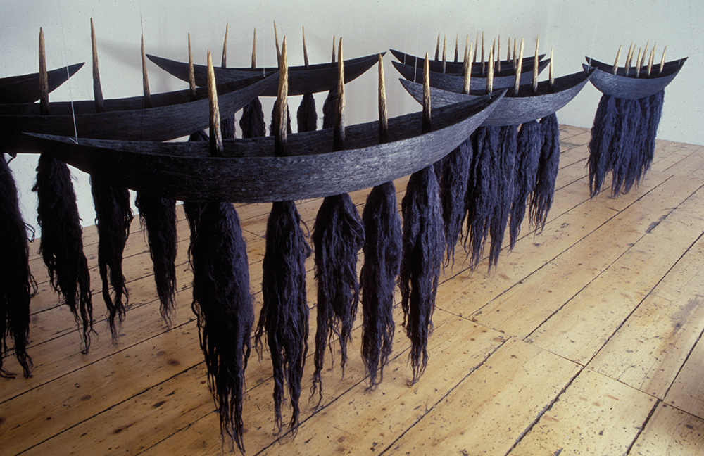 Black Boats / Mondboote, 1999synthetic resin, hemp fibres, pigments15 objects 160 x 30 x 90 cm