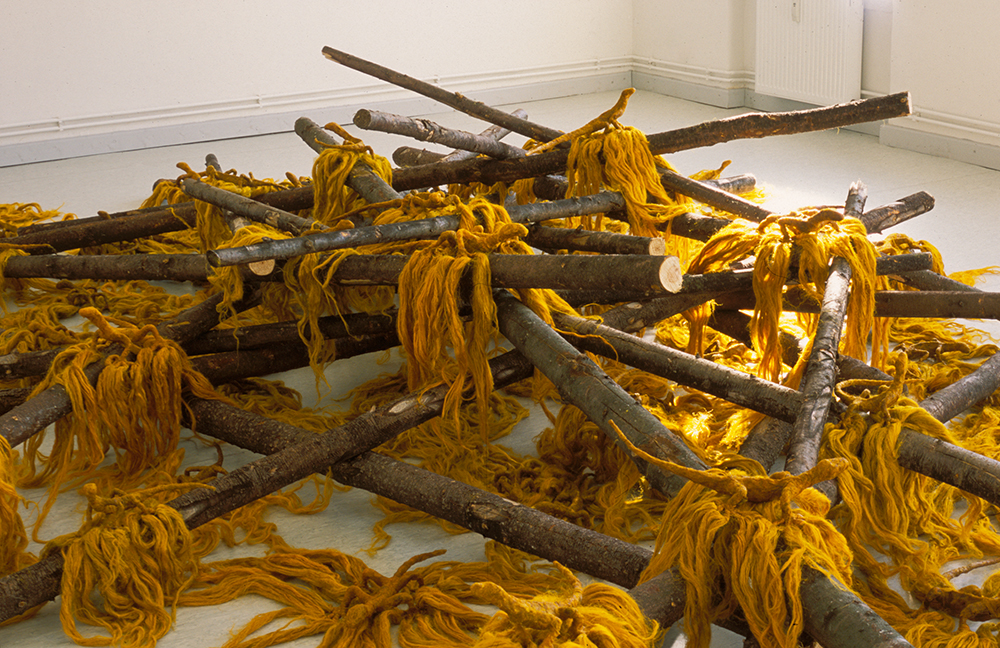 Dragons / Gelbe Drachen, 2003tree trunks, hemp fibres, pigments, synthetic resin60 objects approx.14 x 50 cmWurms, Kunstverein Worms 2003