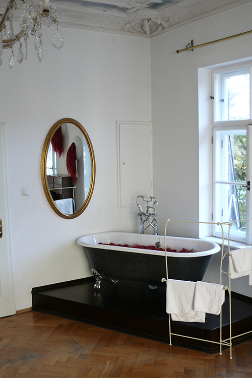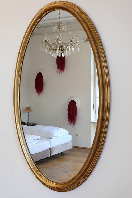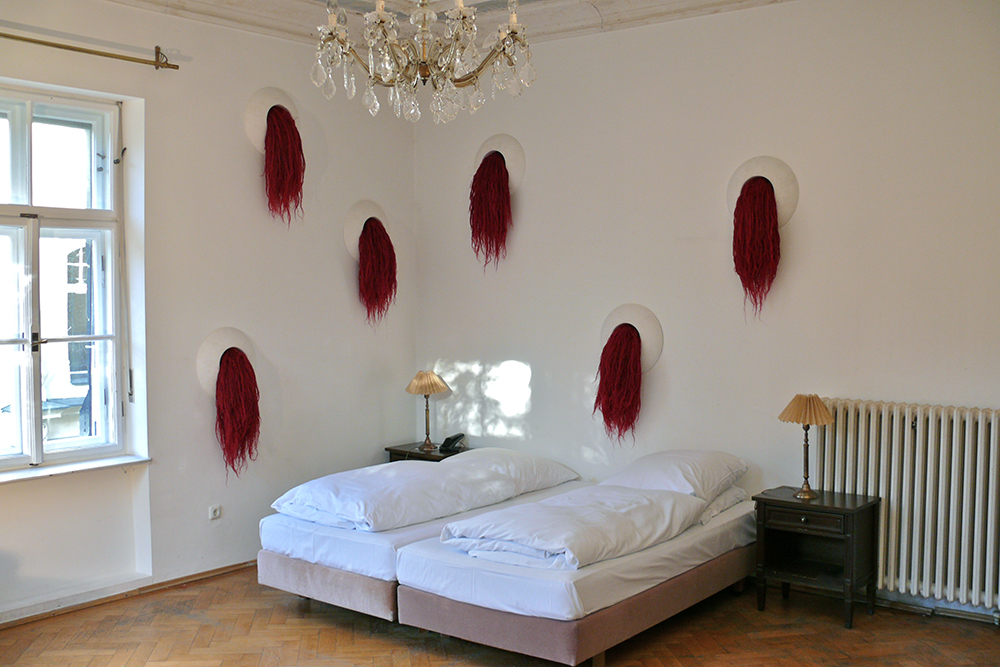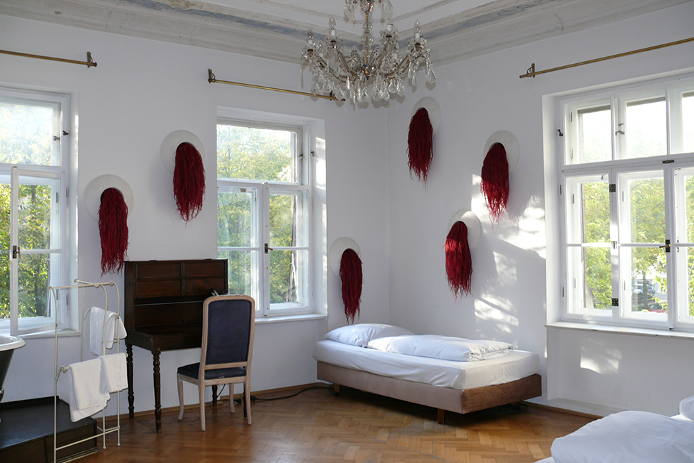 Room To Let / Zimmer frei, 2007Red Fountains, hotel roomacrylic resin, hemp fibre, pigments12 wall objects, Ø 44 cm eachKunstprojekt Zimmer frei, Hotel Mariandl, München 2007