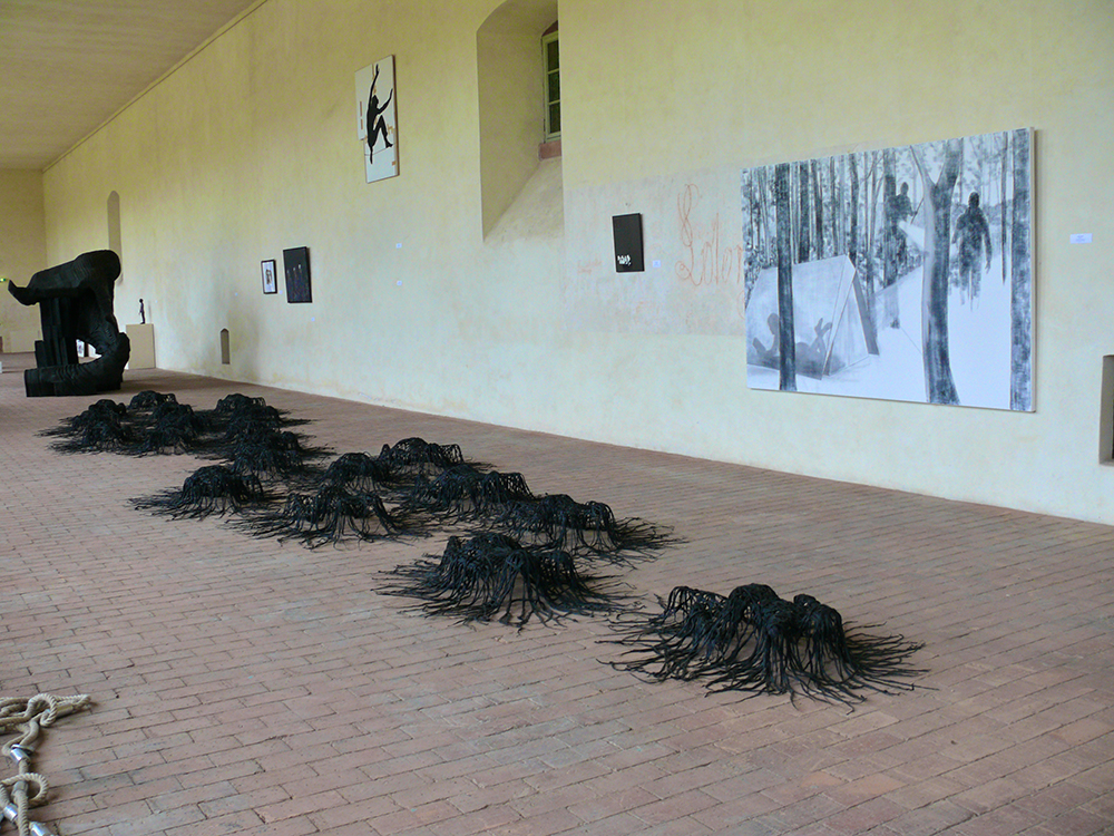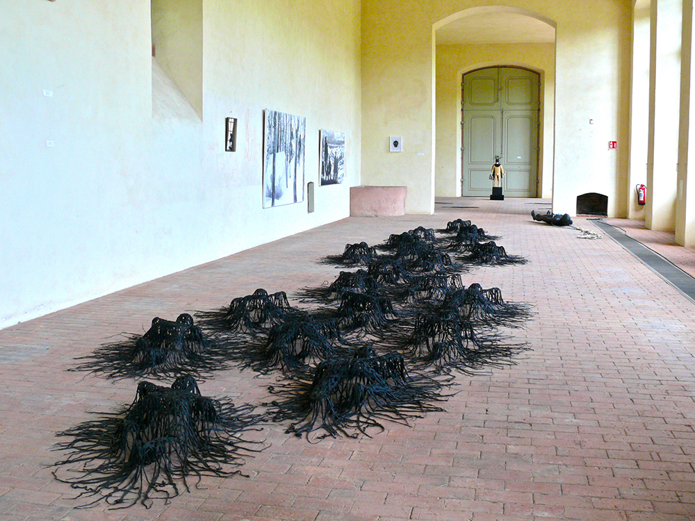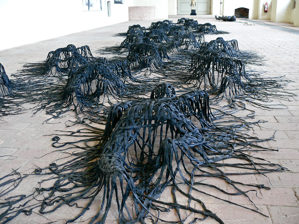 Travellers / unterwegs II, 2011 / 2016hemp fibre, pigments, acrylic resin20 objects about 160 x 140 x 30 cm eachSuezzo, Kunstverein Schwetzingen 2016
